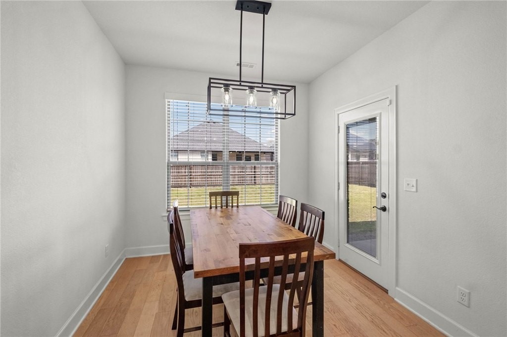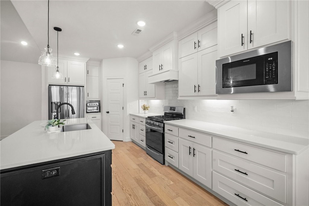 Gorgeous home with an inviting covered front porch that welcomes you to your new open concept living layout. The living room features vaulted ceilings, beautiful wood flooring, and an abundance of natural light, creating a bright and welcoming space. The modern kitchen features a beautiful black island with white quartz counters countered with white cabinets with black pulls and a white subway tile backsplash making this the kitchen of your dreams with ample room for dining. A desirable split floor plan offers added privacy. The primary bedroom has wood floors and an ensuite featuring dual vanities, soaker tub, tiled shower and large walk-in-closet. 3 more generous bedrooms are perfect for the kids or use one as a home office and a full bathroom. The large laundry area makes chore day a breeze. Play out back in the flat, fenced backyard. Ideally located just minutes from downtown Bentonville, this home provides convenient access to schools, shopping, and parks. Enjoy comfort, style, and a prime location all in one!